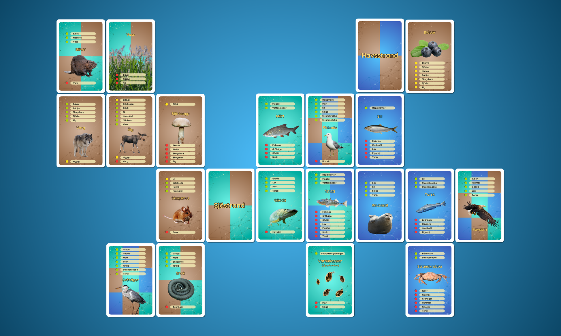 Strandsnäckan äter blåstång – men riskerar själv att bli uppäten av strandkrabban, som i sin tur måste se upp för fiskmåsen! Skog, hav och sjö bubblar av liv – spela Ekosystemkoll och förstå hur olika ekosystem hänger ihop genom de arter som lever där!